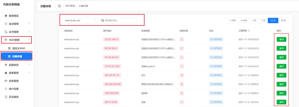 多途云cdn具有强大的waf拦截功能,在CC攻击方面有较强的拦截优势,如因为测试或其他原因被拦截,可以在系统后台查询并解封,具体步骤如下。